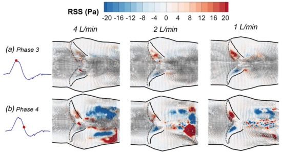 where and represent the velocity fluctuations in x and y dimensions, respectively, and is the density of the fluid. The RSS distributions are compared among the normal 4 L/min, and the reduced CO, i.e., the 2 L/min and 1 L/min cases, at phases 3 (peak systole) and 4 (after peak) are shown in Figure 10 using the same color scales. At the peak systole phase (phase 3), the RSS magnitudes and distributions do not show apparent differences in reduced CO cases (Figure 10a). At phase 4, although the maximum values of RSS downstream of the valve are comparable among three CO cases, more scattered small-scale RSS distribution patterns are seen under reduced CO conditions (Figure 10b). Particularly, more small flow structures were observed near the center region downstream of the valve in the low CO cases. These results suggest that the turbulence is dissipated faster after the peak systolic phase under low CO conditions.