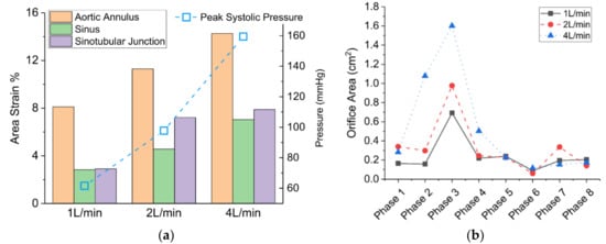 The structure deformation under reduced cardiac outputs. (a) The area strain; (b) geometric orifice area.