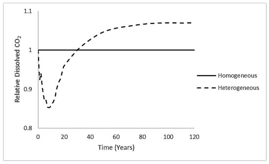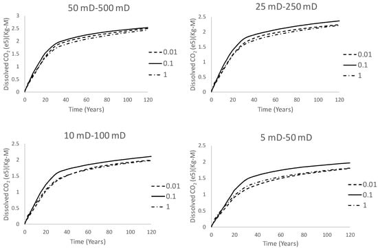 - Heterogeneous permeability plays an important role in aquifer performance and the amount of dissolved CO2 in brine. The results of our study show that different heterogeneous permeability data can result in different amounts of CO2 being dissolved in brine which is ±7% after the injection stops and up to 13% after 120 years based on our simulations. In this regard, the reservoir performance cannot be judged by just adding one set of heterogeneity data. Applying precise and correct heterogeneity data is crucial when investigating the dissolutions by simulations. Higher standard deviation in producing heterogeneity data with the same mean will result in decrease in solubility of CO2 in brine.