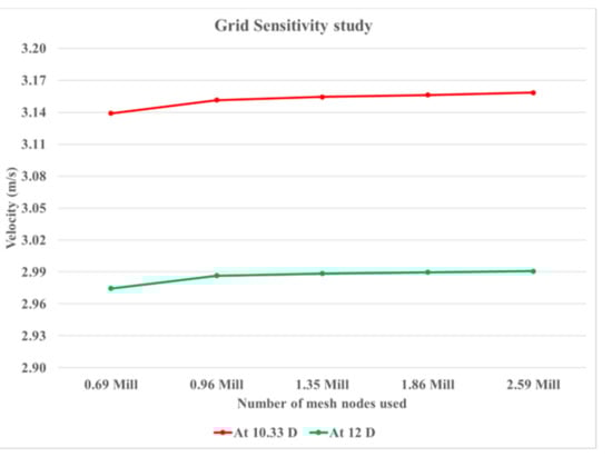 For the case of jet impingement study, the target parameter considered was velocity data along the center line at and beyond the impingement point. The velocity value at 10.33 D and 12 D along the center line was carefully noted for multiple meshes, and the general trend in variation was observed. The data were plotted systematically to identify the point of grid independence, as shown in Figure 7.