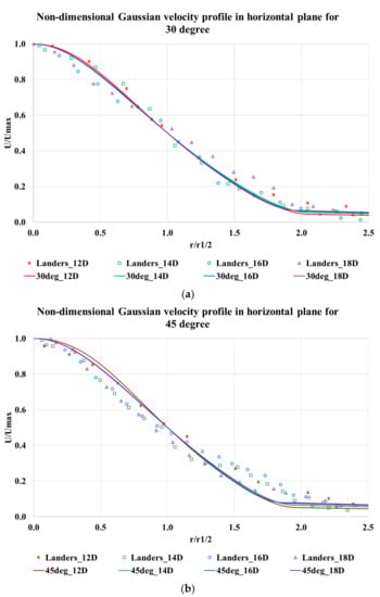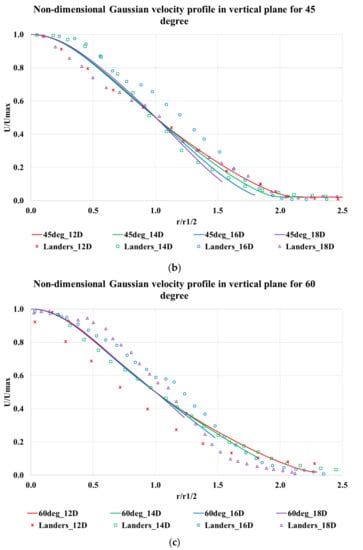The data from all locations along horizontal plane are plotted together in Figure 8a–c. It can be observed that the experimental data fall on a narrow band of values. However, as the impingement angle is increased, the spread in experimental data increased, as shown in the case with 45 and 60 degrees. This was due to the difficulties in accurately measuring of velocity parameters when the flow field experiences high mixing.