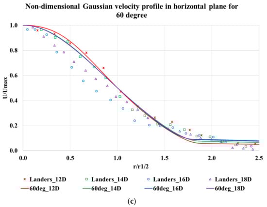 Non-dimensional velocity profile in horizontal plane for different impingement angle: (a) 30 degree; (b) 45 degree; and (c) 60 degree.