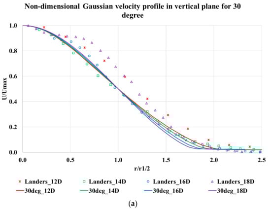 Similarly, data were extracted from vertical plane and plotted along multiple locations downstream of jet impingement and compared with Landers’s experimental data. In the vertical plane, the data spread observed in the experimental results increased, as shown in Figure 9a–c. It was felt that this was due to the higher level of turbulence in the vertical plane. Based on the inherent problems of measuring data in regions of high mixing, it is felt that velocity data obtained from the simulation may be more reliable.