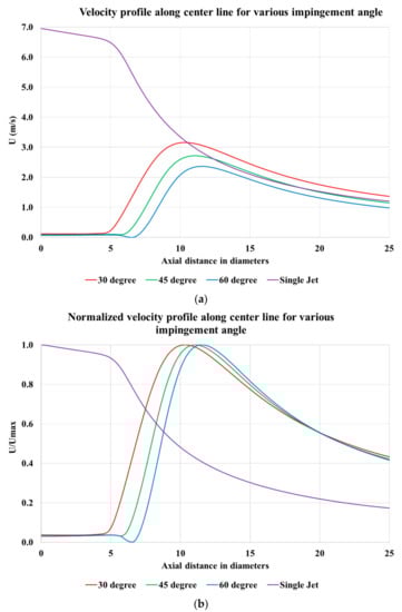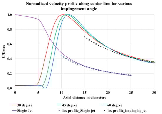 The velocity profile along the center line for three impingement angles are plotted in Figure 10a,b and compared with the single jet data. Beyond impingement point of 10.33 D, the decay rate of velocity along the center line of the resultant jet resembles the decay rate for the single jet. In addition, the maximum velocity in the case of 30-degree impingement angle is higher than the value observed in the case of 60-degree impingement.