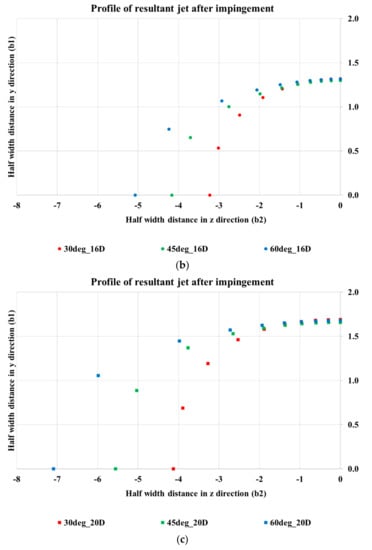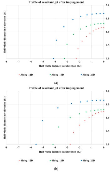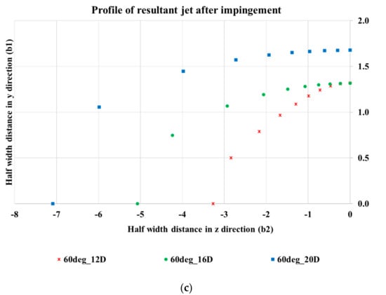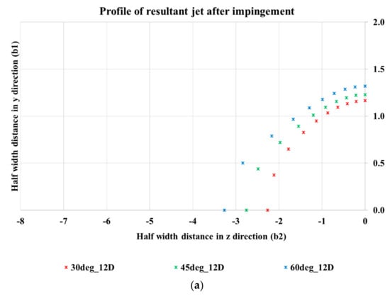 Interestingly, it was observed that, for all the impingement angles, the half distance in y direction reaches a maximum value for any given location beyond 12 D and does not change significantly with impingement angle. For example, the b1 parameter (half width in y direction normalized with diameter of pipe) is approximately 1.3 for all the cases at 16 D from pipe exit and 1.7 for all cases at 20 D. This is clearly represented in Figure 13a–c. Even though the spread in y direction is not affected by the impingement angle, the growth of the jet in z-direction shows promising results. With the increase in in impingement angle, the growth in z-direction increases as we move further downstream.