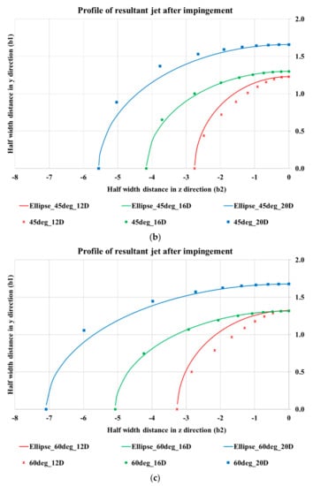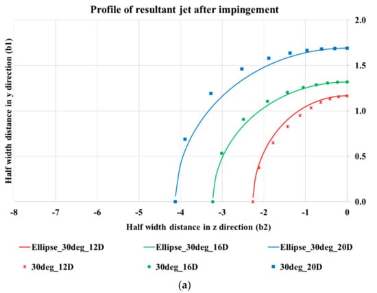 Growth profile along all the location for the three impingement angle cases are plotted in Figure 14a–c. It is observed that, at impingement angles of 30-degree, the profile at 12 D matches with the elliptical profile; but does not tend to match at 20 D. However, in the case with higher impingement angle of 60-degree, the further downstream locations have better match than the upstream location. In all cases, the computed profile closely follows an elliptical shape at 16 D location. For the case with 60-degree impingement angle, we can observe a strong deviation from the elliptical profile at 12 D. This may be caused by the intense interaction between fluid streams which accounts for further developing profile.