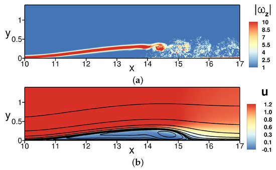 The instantaneous contours of spanwise-averaged -vorticity (a random snapshot after the flow reaches the statistically stationary state) are presented in Figure 2a to gain insight into the nature of the unsteady flow field of the uncontrolled LSB. To have a complete picture of the mean features of the LSB, the time- and spanwise-averaged streamline together with the contours of mean u-velocity are shown in Figure 2b. The laminar boundary layer separates at , followed by a smooth separated shear layer with negligible dependency in the spanwise direction. Downstream of the separation location, the separated laminar shear layer contains inflectional reverse-flow velocity profiles where the normal gradient of the u-velocity is maximum near the inflection points; therefore, the -vorticity attains its maximum value at the same wall-normal location at a given x-location. Initially, the inflection point remains close to the surface, so the viscous instability plays a more important role. Moving further downstream, the thickness of the separated shear layer increases, and the streamwise velocity profiles become very similar to those of the free shear layer. As a result of the large growth rates associated with the separated shear layer instability, the disturbances (originated from numerical and round-off errors) can be strongly amplified and lead to the development of large unsteady vortical structures.
