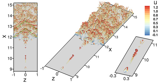 The domain extent and grid resolution used in the present work were guided by the direct numerical simulations of LSBs in [14,15,30]. In the streamwise direction, 1601 grid points are equidistantly distributed in the range . An exponential grid point distribution was employed in the y-direction with 240 grid points. The free-stream boundary of the computational domain is located at . The homogenous spanwise direction (z-direction) was resolved with 127 Fourier modes (200 collocation points) for the domain width of . The coordinates and velocities were made dimensionless with the same length and velocity scales as used in [15,30], i.e., m and m/s, respectively.