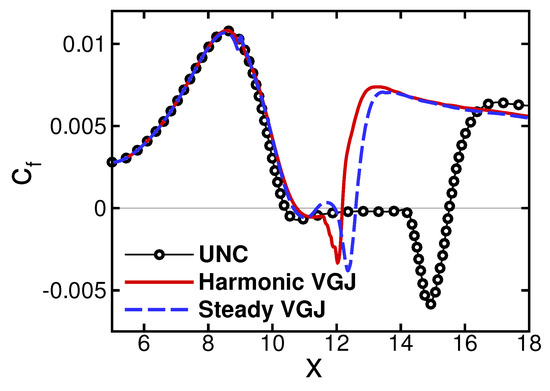 The effectiveness of the vortex generator jet actuation for all cases can be evaluated by comparing time- and spanwise-averaged results. Figure 8 and Figure 9 present a comparison of the skin-friction coefficient, , and displacement thickness, , for the uncontrolled and controlled cases, respectively. While the separation length is significantly reduced using different VGJs, the steady VGJs are less effective at reducing the separated region compared to the harmonic case, as shown in Figure 8. In particular, the mean separation length was reduced by 72% and 62% for the harmonic and steady VGJs, respectively. Here, the mean separation length is defined as the distance between the reattachment point at which changes from negative to positive and the separation location, where changes from positive to negative. It is worth noting that the separation location is delayed for both controlled cases, with the furthest separation location for the harmonic case. The displacement effect of the separation bubble manifests itself as strong increases in the boundary-layer displacement thickness, where is defined as: