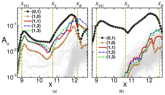Disturbance development of the Fourier modes of controlled flow with different forcing strategies in () notation. Plotted are the maximum Fourier amplitude of disturbance u-velocity. (a) Harmonic and (b) steady VGJs. The vertical dashed lines correspond to the forcing location, mean separation and reattachment locations .