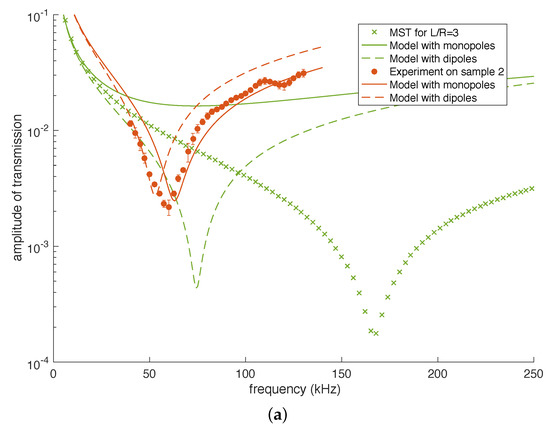 The dipole scattering of the bubbles being much weaker than the monopole one, we could expect the last term of Equation (11) to bring a negligible contribution to the transmission. This is not always true because rather than comparing to , one needs to compare to , which reaches small values close to the minimum of transmission. We can establish that monopole and dipole contributions will be of the same order of magnitude when , which results in the following criterion on :