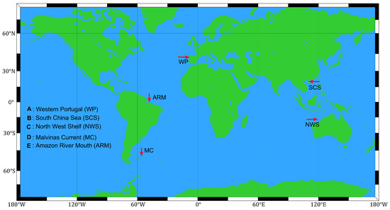 Our main concern in this paper is with the term , which represents non-conservative effects arising from the horizontal variability in the underlying basic state density stratification and current. An outline of the derivation of (1) was given by Liu et al. [12] and for convenience is briefly summarised here in Section 2, emphasising how the “new” term arises. It is present because the vKdV Equation (1) describes the evolution of a wave field about a basic state which may not be in exact equilibrium due to the inhomogeneous background state. That is, it does not satisfy the underlying conservative full equation set, in this case the two-dimensional Euler equations, which can be constructed from a Lagrangian. Andrews and McIntyre [13], Grimshaw [14], have described in a general context how this term arises when considering wave action conservation. We use the term “non-conservative” here and throughout in the restricted sense that it is non-conservative only because the horizontal variability of the basic state current and density fields, taken from oceanic data, may not satisfy the two-dimensional Euler equations. Note that the horizontal variation of the fluid depth h is mainly already accounted for in the linear magnification factor Q, and ensures that the wave action flux is conserved in the conservative case. Although the “new” term has the form of Rayleigh friction, importantly this term has no connection with dissipative processes on the internal waves themselves. Unlike the usual Rayleigh friction, varies with distance, can be positive or negative, and indeed can change sign along the wave path. Although this term has been known for over three decades, it has usually been neglected in modelling studies. Zhou and Grimshaw [11] examined some possible scenarios of how the term might arise, and, recently in Liu et al. [12], we examined its effect for a model two-layer fluid and for three oceanic cases previously considered by Grimshaw et al. [15], where the term had been omitted. In this paper, we use climatological data from five typical oceanic sites where internal waves have been observed. Importantly, we also now include a background current, which was of necessity omitted in Liu et al. [12] because of the lack of suitable current data.