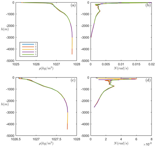 Background density and buoyancy frequency distribution along the transect of the Malvinas Current case. (a,b) are situations in summer, while (c,d) are in winter. Five different lines in each panel represent situations on the chosen five points along the wave propagation transect.