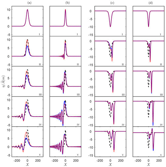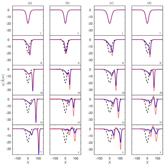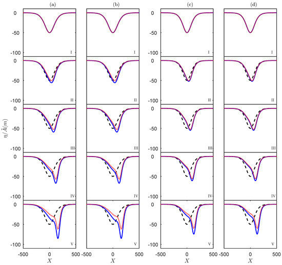 A numerical simulation of the vKdV Equation (5) for the Western Portugal case for summer (a,b) and winter (c,d) conditions, with (a,c) or (b,d), respectively. The initial condition is the solitary wave (black, dash), the numerical solution is (red, dot) and the physical solution is (blue, solid). From top to bottom, the distances from the initial point are (I) 0 km, (II) 110 km, (III) 220 km, (IV) 330 km, (V) 440 km, respectively.