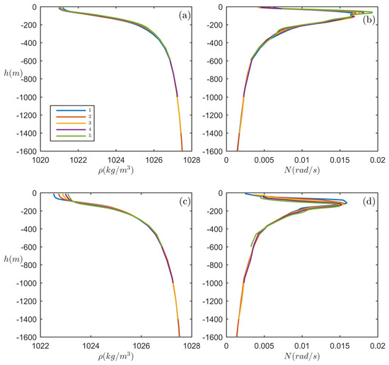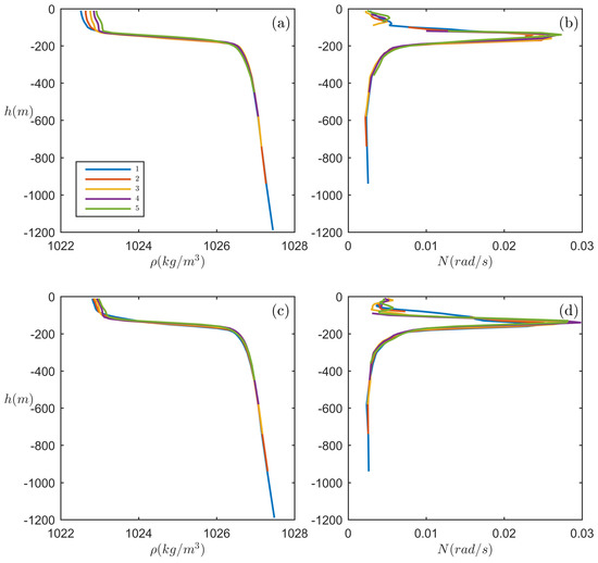 Background density and buoyancy frequency distribution along the transect of the South China Sea case. (a,b) are situations in summer, while (c,d) are in winter. Five different lines in each panel represent situations on the chosen five points along the wave propagation transect.