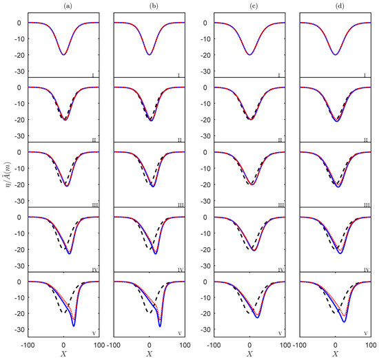 A numerical simulation of the vKdV Equation (5) for the North West Shelf case for summer (a,b) and winter (c,d) conditions, with (a,c) or (b,d), respectively. The initial condition is the solitary wave (black, dash), the numerical solution is (red, dot) and the physical solution is (blue, solid). From top to bottom, the distances from the initial point are (I) 0 km, (II) 110 km, (III) 220 km, (IV) 330 km, (V) 440 km, respectively.
