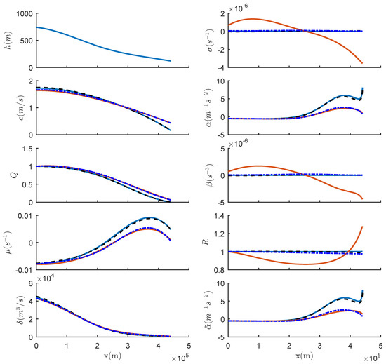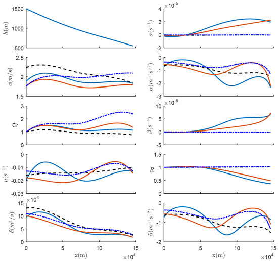 In a typical oceanic case when , this yields the estimate . For instance, with = 100 m, a depth h = 1000 m and c = 1 m s−1, this yields s−1 even for a large amplitude wave where m . Thus, especially in deep water, we expect this frictional term to be insignificant, but it could become comparable with the non-conservative term in shallow water. For instance, in shallow water where , this same estimate becomes s−1. To examine this in more detail in the present context, we plot the frictional index for each of our five case studies in Figure A1, where we set equal to the initial wave amplitude. In all cases, this index is at least an order of magnitude smaller than , indicating that, by comparison, this frictional term can usually be neglected. However, as indicated above, in very shallow water, the frictional index increases to a level where the frictional term should be taken into account. Note the curious exception of the SCS, where the frictional index decreases as the depth decreases.