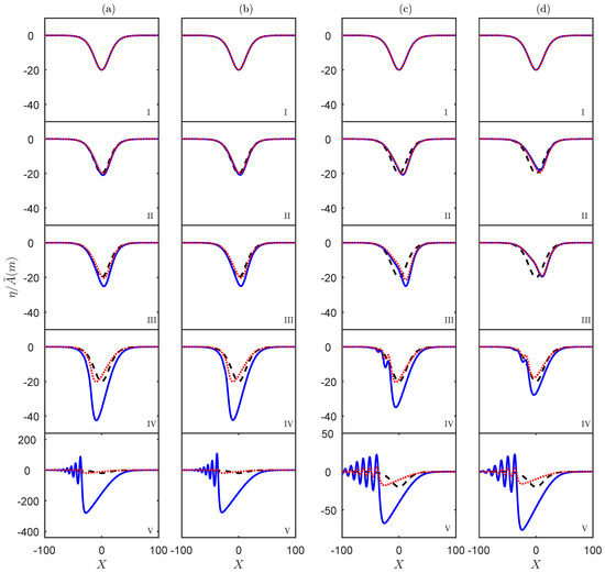 A numerical simulation of the vKdV Equation (5) for the South China Sea case for summer (a,b) and winter (c,d) conditions, with (a,c) or (b,d), respectively. The initial condition is the solitary wave (black, dash), the numerical solution is (red, dot) and the physical solution is (blue, solid). From top to bottom, the distances from the initial point are (I) 0 km, (II) 110 km, (III) 220 km, (IV) 330 km, (V) 440 km, respectively.