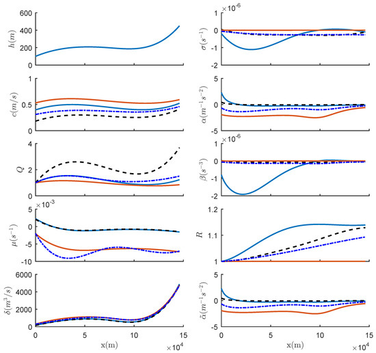Variation of the original coefficients (left panel and top of the right panel) and derived coefficients (remainder of the right panel) of the vKdV equation for conditions of the Amazon River Mouth case. The results show the coefficients in summer with background current (blue, solid), without (black, dash) and the coefficients in winter with (red, solid), without (blue, dashed-dotted).