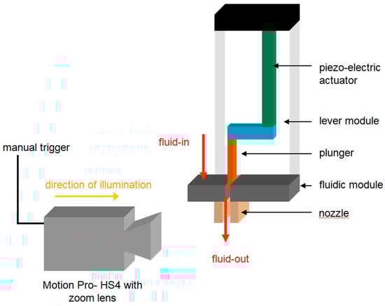 We used a ceramic plunger with a diameter of 1.5 mm for all of the fluid compositions examined, since it is superior with regard to the reduction of particle aggregation in comparison to metal plungers, and it provides the best fit to the inner nozzle curvature. By implementation of the high-speed camera Motion Pro-HS4 (Redlake MASD, LLC, Tucson, AZ, USA) and a zoom lens, drop formation and drop deformation at high dosage velocities were recorded. The magnification remained fixed and drop images were collected in a “free fall position” without a view of the target substrate (see Figure 2 for the camera placement). To achieve stable droplet geometries, the dispensing was performed in a so-called burst mode which is defined as jetting an infinite series of droplets at a set of fixed parameters. A delay time of 400 ms was programmed between drops while the image recording was triggered at every tenth drop.