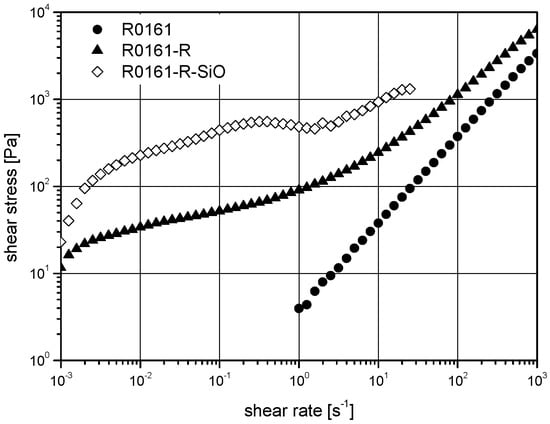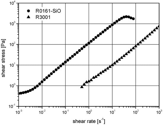 A combination of the resins REPDTP or R0161 with nanoscale fillers and glass spheres increases the shear viscosity substantially (materials of category III, Figure 4 and Figure 5). The so-called dispersions show a pseudo-plastic characteristic. In comparison with REPDTP-R and R0161-R, the viscosity increases by one order of magnitude due to the addition of glass spheres. Furthermore, particle–particle interactions affect the low-shear regime around 0.002 s−1 for R0161-R-SiO and the superstructure plateau of REPDTP-R-SiO around 0.1 s−1 by an increase of flow resistance.