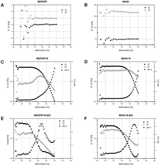 Both test systems of category III show an equivalent flow behavior in comparison with modified materials of category I, but with a Newtonian transition at smaller shear strain values, see Figure 7E,F. A key factor is the enhanced local shear strain in the vicinity of the glass spheres. Similar to the thixotropic modifications REPDTP-R and R0161-R, storage moduli of REPDTP-R-SiO and R0161-R-SiO are also comparable whereas the dissipative effect of glass spheres leads to a higher G″ level. For increasing shear strains, a peak in the loss tangent is found which is caused by hard elastic particle interactions between the glass spheres.