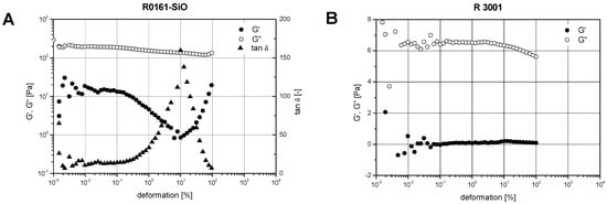 As discussed earlier, Underfillers show a viscosity plateau over a wide shear rate range. Due to a Newtonian flow, characteristic sol states are observed in strain sweeps for R0161-SiO and R3001 with a nearly constant loss modulus G″, see Figure 8. Although elastic softening is negligible for R0161-SiO, a local minimum in the storage modulus G′ is seen with increasing deformation indicating the presence of hard elastic interactions of glass spheres. In agreement with viscosity measurements accomplished by strain rate sweeps, the loss modulus G″ of Underfiller R3001 is lower by several orders of magnitude compared to the model system R0161-SiO.