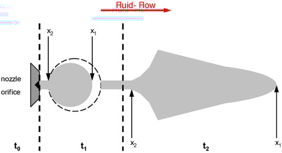 Figure 9 shows a schematic of the two jet stages as they evolve with time. For further analysis, we define a reference time, t0, which corresponds to the time when the material exits the orifice. Jet phase I (from t0 to t1) is characterized by (a) moderate flow rates out of the nozzle, (b) by the plunger being in a raised position, and (c) an open valve status. Because of slow fluid accumulation at the nozzle orifice, a standard drop with spherical shape is formed. As soon as the opening interval reaches its pre-defined end-stage, the plunger is accelerated continuously downwards up to its maximum velocity. A major amount of fluid is subsequently pushed through the nozzle and the primary drop undergoes a geometrical change from a spherical to a primary thread (interval t1 to t2). When the plunger makes contact with the nozzle pan, vibrational states are injected into the primary thread and stage II of the jet process is reached. The primary thread elongates successively as the plunger impulse moves through the fluid and accelerates the tip.
