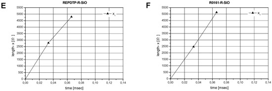 To determine sol and gel states, as well as the sol-gel transition strain, sweep tests under oscillatory shear at a frequency of 6 rad/s were performed and are presented in Figure 7. Due to limited stress responses of low-viscosity fluids at small shear deformations, a critical value of the shear strain has to be reached in order to measure the storage modulus, G′, and loss modulus, G″, accurately. tan δ is referred to as the loss factor and is obtained as a ratio of the loss modulus G’’ to storage modulus G’. It is important to note that a loss factor tan δ > 1 describes a gel state while a loss factor δ < 1 indicates a sol state of the viscoelastic fluid. According to the Winter–Chambon Spectrum [23], the so-called gel point is reached at a frequency-independent loss factor close to tan δ = 1. For the Newtonian systems REPDTP and R0161, a sol state at a constant modulus can be verified for the deformation range investigated. One can easily identify the viscosity difference between the two fluids by the different values of the loss moduli G″, see Figure 7A,B.