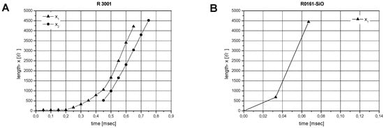 The time-dependent drop deformation stages in terms of positions x1 and x2 (beginning and end) of the primary drop/primary thread are presented in Figure 13. For the resins REPDTP and R0161, one can easily observe an abrupt change of slope at 0.35 ms which corresponds to an acceleration of the dispense velocity leading to a steep increase of x1 and x2 over time. Different slopes of x1 and x2 indicate different velocities of drop tip and drop end and thus a stretching of the thread. Samples REPDTP and REPDTP-R are characterized by a specific starting point for the steep increase of positions x1 and x2, as well as a continuous stretching and diameter reduction. We note that for sample REPDTP-R, a delayed transition to jet phase II takes place. During impulse transfer from the plunger to the fluid, the starting point of fluid stretching is shifted to later time frames compared with the unmodified REPDTP. This observation correlates with the rheological data and we conclude that the characteristic jet behavior of REPDTP-R is caused by enhanced viscoelasticity and thixotropy. Thixotropic modifications of REPDTP systematically preserve a low loss modulus G″, as shown in strain sweeps, see Figure 7. Comparing REPDTP-R and R0161-R, both systems have comparable network stability indicated by G′, whereas R0161-R does not show a transition from jet phase I to jet phase II after impulse transfer from the plunger to the fluid.
