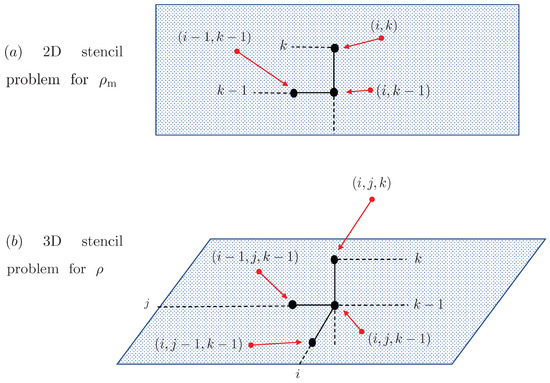 is less than a fixed tolerance. The numerical scheme is implemented through a first-order upwind scheme for both Equations (17) and (17). A schematic representation of the stencils for the finite difference schemes for and is shown in Figure 2.