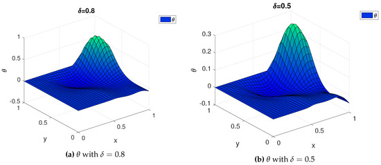 We solve the problem using the perturbation of Equation (30) and with the numerical scheme of Equation (21), getting two solutions, and , where is the analytical solution using the perturbation and is the solution obtained with the numerical scheme. We plot the difference of for different values of . In other words, we show that the perturbation is advantageous when the boundary data are small perturbations of the homogeneous case. Notice that, when , the numerical solution is exactly the one plotted in Figure 3. In Figure 5 and Figure 6, the function (absolute error) is plotted for decreasing values of . As one can notice, the error decreases for decreasing , as expected.