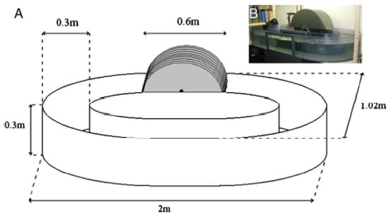 Turbulence was generated by means of fixed PVC grids illustrated in Figure 1 (grid diameter 2 mm, mesh size 1 cm) located every 50 cm in a unidirectional oval flume (2 meters long and 1 meter wide, with a working channel section 30 cm wide and 30 cm deep), where a mean flow was generated by the friction of 10 vertical parallel PVC disks (5 mm thick and 0.6 m in diameter) on the surface of the water. Instantaneous horizontal turbulent velocity was measured by high frequency (100 Hz) hot-film velocimetry (DANTEC Serial #9055R0111), and the turbulent energy dissipation rate (m s) was derived following Tennekes & Lumley [17] from the turbulence spectrum obtained from Fourier analysis of time series data recorded by the hot-film probe as