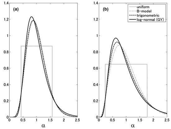 This work considers four pdfs: the three defined in Equations (21), (43) and (44), and the log-normal pdf of GY in Equation (45). First, we investigate how the distributions of these various pdfs compare with one another once the system of Equations (40) to (42) is solved to determine the pdf parameters. The distributions for the case where are plotted in Figure 4. In Y90 (see Figure 1 of the Y90 manuscript [6]), the corresponding log-normal and beta distributions were markedly different; the beta distribution was about half the width of the log-normal case. The reason for this was that in Y90 the plots were done for , and so the parameters were off by a factor of . A consequence of the above corrections is that the difference virtually disappears. The log-normal distribution is slightly shifted to the left of the beta-distribution, with a longer logarithmically falling off tail. However, the values of and from Table 1 show that they are very close to each other statistically. In fact, the trigonometric pdf also agrees very well with the two. Naturally, given its very different character, the uniform distribution does not line up as nicely as the others do; however, the parameters in Table 1 derived from solving the system of Equations (40) to (42) give very similar values of and for the uniform case also.
