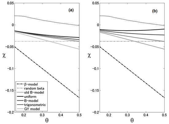 Correction factor for the universal spectrum slope with (a) , and (b) . The dotted line of the old B-model is done for in both cases. Gray-scale solid lines are listed in the legend in the order they appear in the figure from top to bottom.