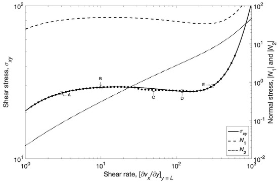 Equations (28)–(31) are the main results of this section. It is noticeable that this formulation leads to structure-dependent variables, i.e., viscosity (), stress relaxation time (), and diffusion coefficients ( and ). The structure itself follows an evolution Equation (28). In the limit (constant structure) with no normal stresses, Equation (29) reduces to the simple-shear version of Equation (26). These equations contain seven constants. Five of them (, , , , ) can be evaluated from independent rheological experiments [4]. Under heterogeneous (shear banding) flow, (the shear-banding intensity parameter) is related to the position of the stress plateau (set by the equal-areas criterion or equal minima in the dissipated energy) and may be evaluated from data of interface diffusion. Dhont [27] has suggested an expression for the relaxed stress under simple shear (without normal stresses) similar to that of Equation (25), in which the term () is identified with the “curvature viscosity”, which actually follows the same form of the shear-thinning viscosity observed in worm-like micellar solutions. According to the magnitudes shown in [27], usual values for the zero-shear rate viscosity are around 20 Pas. In the absence of normal stresses, the reaction-diffusion character of equation is preserved