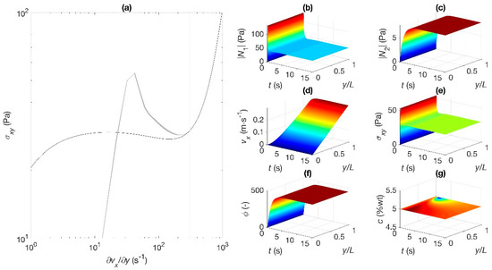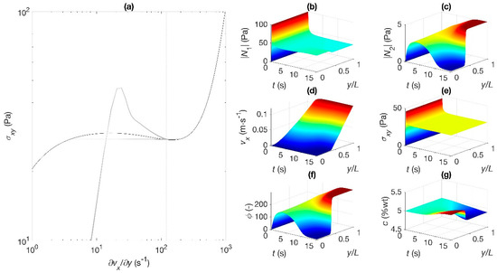 Finally, in Figure 6a–g, the reference shear rate is 300 s−1 located in the high shear-rate branch (point E in Figure 1). Past an overshoot, the transient dynamics ends at the high shear-rate branch of the flow curve. The flow is again homogeneous, since a single velocity gradient is predicted (Figure 6d). Concentration gradients are absent at steady state and fluidity is uniform again (Figure 6f,g). The shear stress and rapidly attain steady state after maxima following the inception of flow (Figure 6b); attains steady-state monotonically (Figure 6c).
