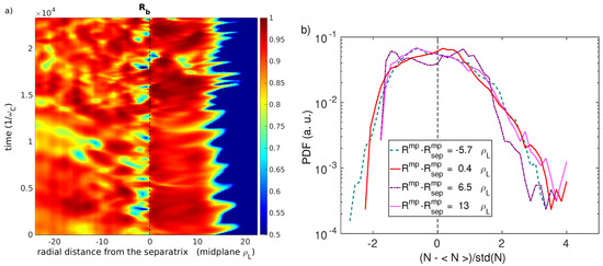 The transport barrier seems also to locally alter the statistical properties of turbulent fluctuations. Figure 6b represents the Probability Density Function (PDF) for different radial positions at the LFS midplane of the simulation. The probability density function of density fluctuations, which are usually generated at the innermost flux surfaces, have an almost Gaussian shape before encountering the barrier, and get increasingly positively skewed propagating radially outwards. However, the effects of the barrier are visible after the separatrix. As one can see from Figure 6b, the PDF calculated just outside the separatrix has a hollow profile: this suggests that while large-amplitude events can survive the barrier, small ones are more easily damped, and thus less probable in the near SOL. The usual, positively skewed shape of the PDF is re-established further in the SOL, as it was observed in former simulations in limiter configuration [36].