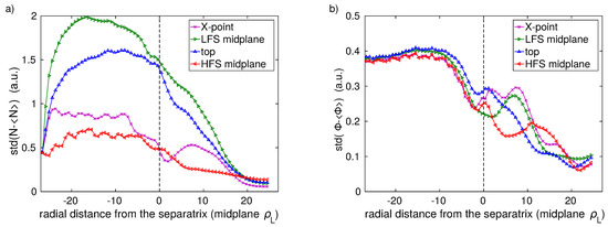 (a) Radial profiles of the standard deviation of density fluctuations, plotted at different poloidal position. (b) Same plot for the electrostatic potential fluctuations.