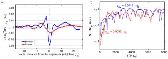 (a) Radial shear of the poloidal velocity averaged in time and over the flux surface and remapped at LFS midplane in a COMPASS-like and in a limiter simulation. (b) Time trace of density fluctuations, calculated at the LFS midplane at , including the linear phase, in divertor and limiter configurations. Dashed lines indicate the exponential fit used to evaluate the linear growth rate.
