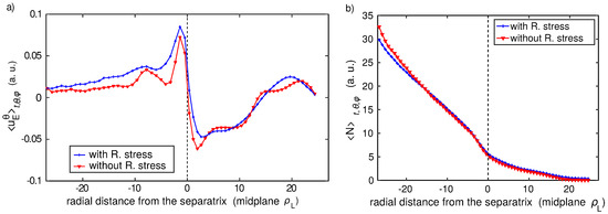 In TOKAM3X model, the radial derivative of the Reynolds stress is contained in the advection term in vorticity equation. The other terms, however, contribute as well to determine the equilibrium profile of the velocity. To investigate the impact of the Reynolds stress mechanism on the formation of the transport barrier, we run a divertor simulation with the same physical and geometrical parameters as the previously described one, and we artificially suppress the Reynolds stress term in the vorticity equation. The resulting profile of poloidal velocity is represented in Figure 9a.