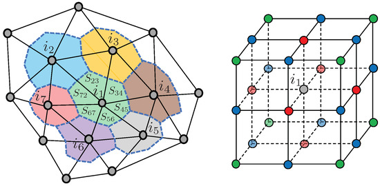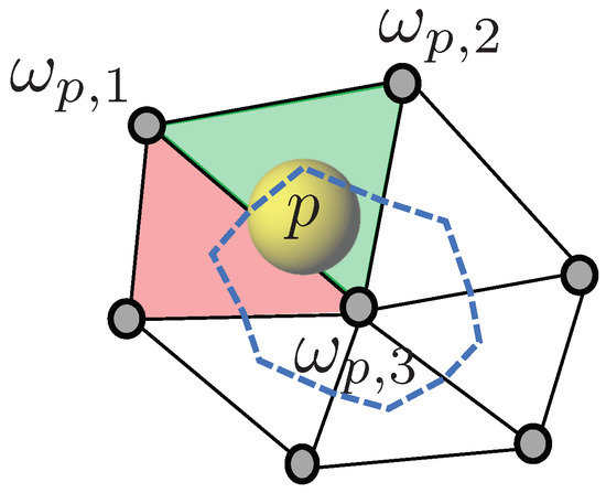 Here denotes the control volume of node i and ‘’ means ‘all particles belonging to any surrounding cell (SC) of node i’. Referring to Figure 1, it means that any particle belonging to one of the cells will be accounted for when computing (as well as ) at node 3.
