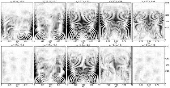 Figure 17 shows the time-averaged field of the solid mass flux for the two sets of simulations. From the visualizations, it appears that friction affects significantly the magnitude of the solid flux and the extent of the mixing loops. In some cases, it also affects their position from the bottom of the bed. As previously observed for the particle volume fraction distribution, the position of the centre of the double mixing loop moves upwards when increases (upper pannel). This point is not straightforward when is increased (bottom panel). However, qualitatively speaking, the magnitude of the solid flux exhibits a maximum for in both sets of simulations.