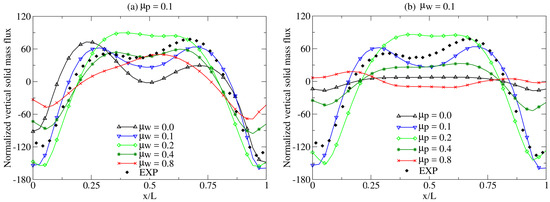 A quantitative analysis of the solid flux may be performed via its vertical profiles at a given height of the bed. Profiles of the time-averaged normalized vertical solid mass flux are depicted in Figure 18a,b for the two sets of simulations. The profiles are taken at the height ( cm) above the bottom of the bed, for which experimental data are available. In all the simulations, two distinct parts for each profile can be observed. The first part corresponds to a nearly flat profile located in the region spanning the center of the bed and the second one is a sloped profile starting from the side walls. The expansion of one part to the detriment of the other depends on the values of the friction coefficients and . These coefficients also determine the maximum values of the upward and the downward mass fluxes in the flat and the sloped parts, respectively. The figures show that when or increases up to , the downwarding flux increases and the upwarding flux, close to the center of the bed, decreases. This leads, at the same time, to a steeper slope of the solid mass flux profile in the sloped part and to a less broad flat part at the center of the bed. For a stronger friction, either at wall or between particles, larger sloped parts are still observed, but with less steep slopes, leading to the decrease of both the downwarding and the upwarding solid fluxes. Therefore, despite the differences observed concerning the volume fraction and the agitation energy of the particulate phase, simulations C4 and C5 predict similar characteristics (field and magnitude) of the solid mass flux. It is conjectured that, in this confined configuration, when the wall friction coefficient increases, the front and back walls may considerably contribute together with the side walls to propagate stronger wall frictional effects towards the bulk bed. This has already been shown in a previous CFD/DEM study of Li et al. [33] for bed thicknesses of 10 and 20 particle diameters in a bubbling fluidized bed. As a consequence, stronger wall friction may produce almost the same effect on the solid flux as that induced by the friction between particles.