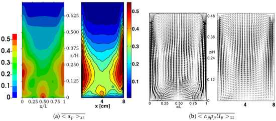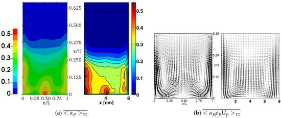 Numerical (a) against experimental (b) time-averaged fields of the volume fraction and the mass flux of the solid phase. and bed weight 75 g. In the simulation, .