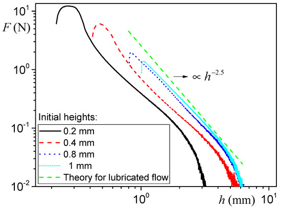 The force during such a test strongly decreases with the distance and approximately follows a slope of −2.5 in logarithmic scale (see Figure 4), which tends to confirm the validity of Equation (10). However, we can remark that the force curve is shifted towards smaller values when the initial distance is smaller, in contradiction with the above theory since expression (10) only depends on the sample volume and the current distance. This is explained by the development of fingering, which implies that some significant parts of the material do not flow anymore in the radial direction.