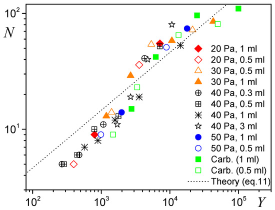 All the data are shown in Figure 6, where we can see that globally the theoretical prediction is in agreement with the experiments: all the data for the different fluids, different initial distances, and different sample volumes, fall along a master curve which corresponds to an increase of the finger number following on average the theoretical curve. Nevertheless, we can note some discrepancy: at low Y values, the finger number is systematically below (by a factor about 1.5) the theoretical prediction, which suggests that, in that case, the elongational component of the flow plays some significant role and slightly dampens the instability; at large Y, the finger number is slightly above the theoretical prediction, but we have no explanation for that.