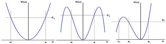 which determines two real roots a and and imaginary roots. If and p is still even, the potential function changes its parabolic shape to a more complicated one, similar to a two-humped camel’s back shown in Figure 1, middle panel. In this case, the pit in the middle corresponds to the case of small amplitudes and the humps on the sides—to big amplitudes. Accordingly, waves do exist only for bounded magnitudes of amplitudes that can be found from the condition
