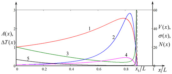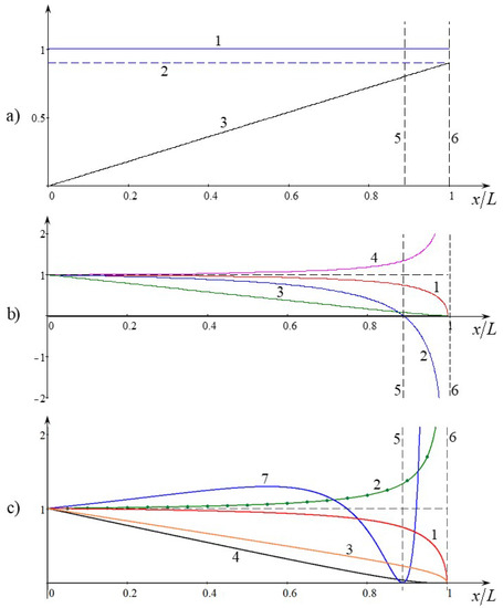 The dependences of these coefficients on the distance are shown in Figure 1b. The nonlinear coefficient vanishes at some distance , where becomes equal to . Then, it changes its sign and becomes positive. This effect is well-known (see, e.g., References [35,36] and the references therein). To avoid confusion, it should be kept in mind that the the nonlinear coefficient in this figure is presented in the normalised form , therefore this ratio is positive when and becomes negative when .