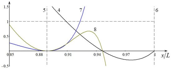 When x becomes greater than , the soliton amplitude and velocity formally increase again and go to infinity when (this is not shown in the plot). However, the adiabatic theory breaks much earlier, when , and the process of wave transformation in the vicinity of this point should be reconsidered more thoroughly, apparently, on the basis of primitive equations.